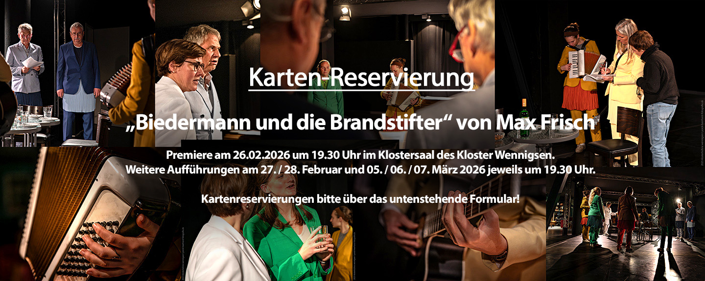 Die Klosterbühne Wennigsen verkauft keine Karten. Wir benötigen aber die verbindliche Platzreservierung auf Ihren Namen. Bitte nutzen Sie die untenstehenden Möglichkeiten zur Reservierung für die jeweilige Produktion.